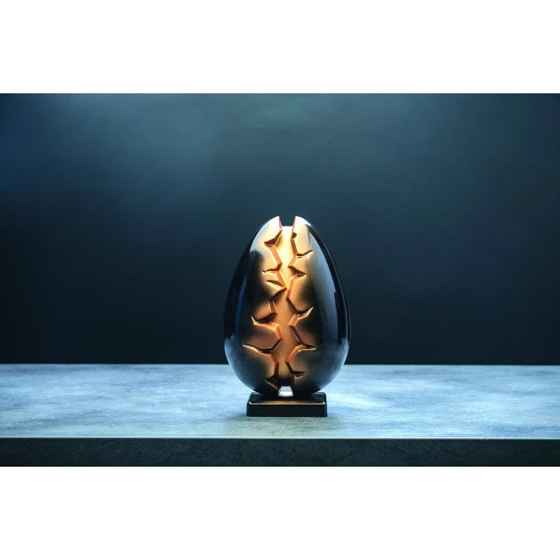 Vos plus jeunes clients craqueront pour cet Oeuf de Pâques Abyss, qui laisse penser qu’il est sur le point d’éclore et de faire apparaître un dinosaure. Le Moule Chocolat Oeuf Abyss Pavoni permet la confection de 2 moulages en chocolat avec chacun son socle respectif. Le Moulage Chocolat Pâques fera 14 cm de diamètre pour une hauteur de 21,5 cm.